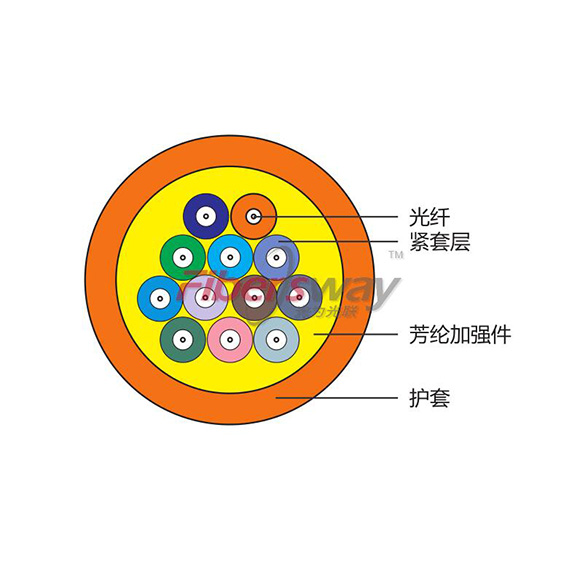 Structurally for GJPFJV(GJPFJV) [nonmetal strength, tight covered, jacketed by PVC (or LSZH) optical cable for indoor communication ] optical cable, the jacket material with high bonding strength is directly covered outside the single-mode or multi-mode optical fiber to prepare the jacketed optical fiber. Specifically, the high-intensity aramid fiber as the strength is adopted outside several single-mode or multi-mode jacked optical fibers, and is then externally extruded with one layer of PVC (or LSZH) sheath.